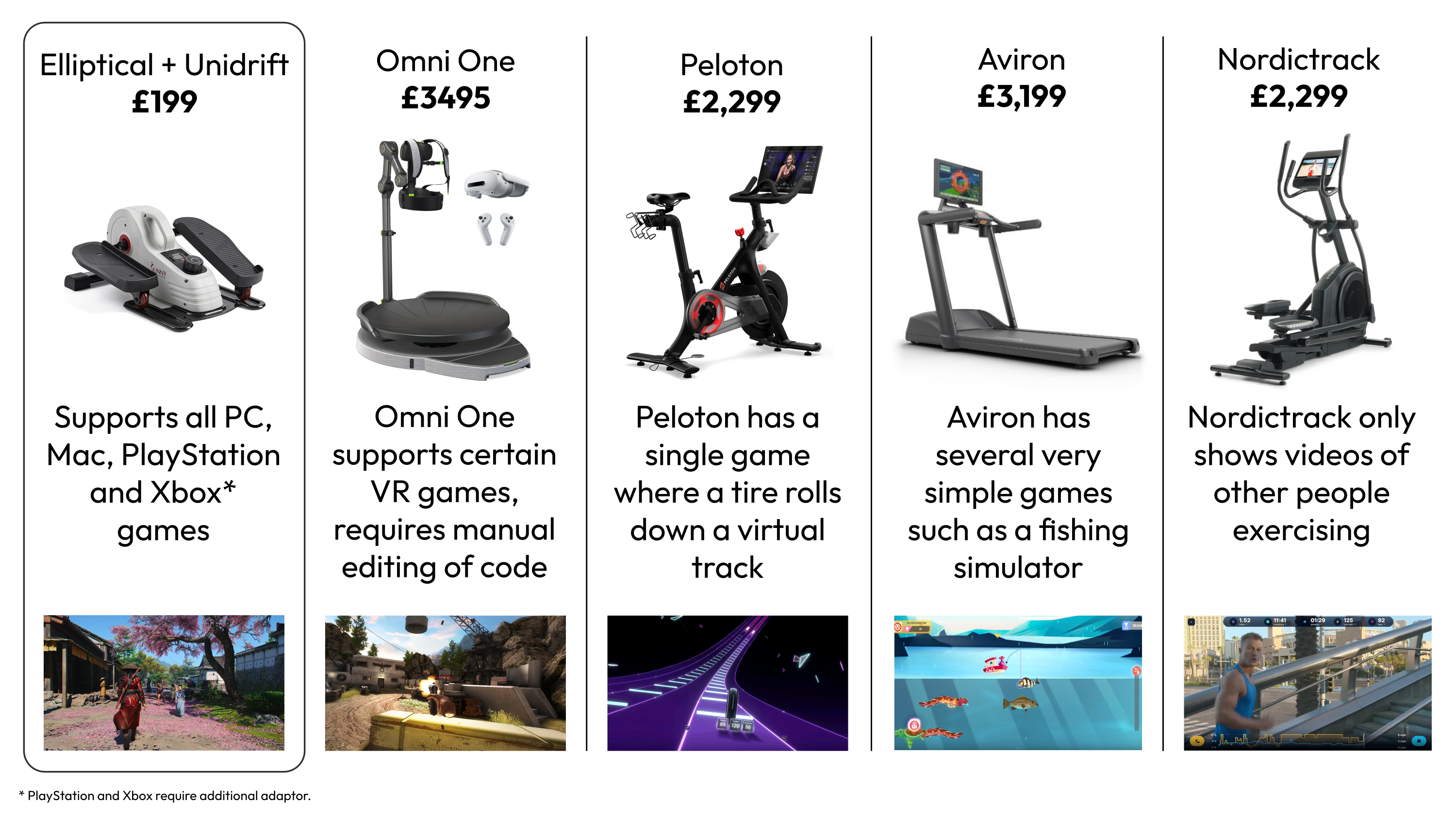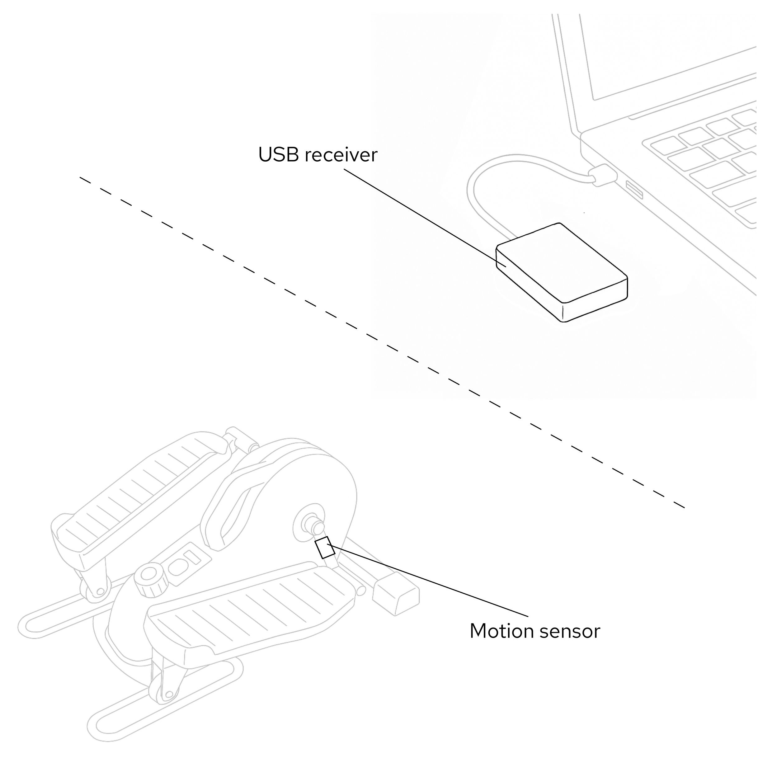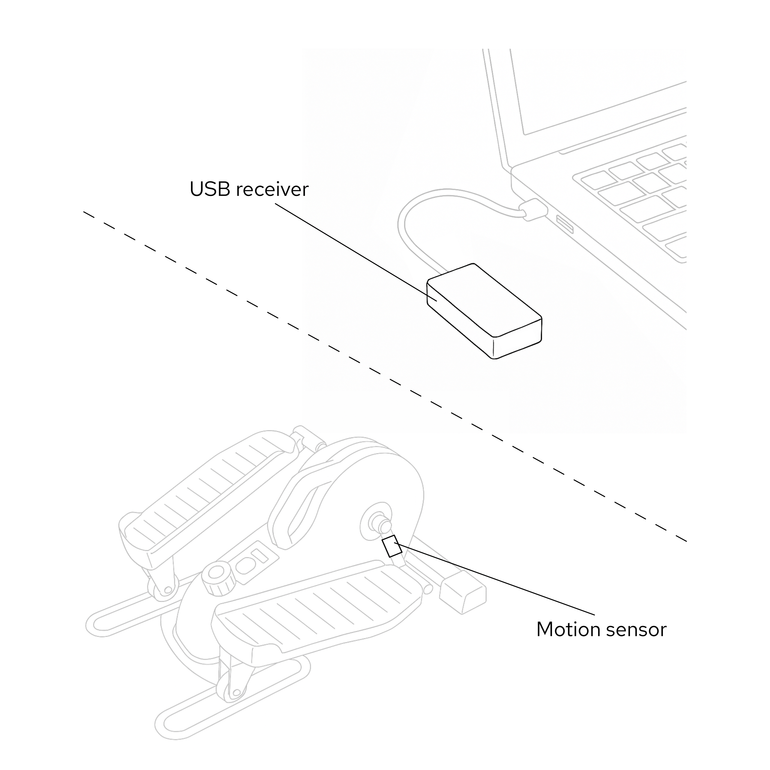 A motion sensor attaches to your exercise machine and tracks your physical speed and direction. A USB receiver receives this data wirelessly and emulates the corresponding game inputs.