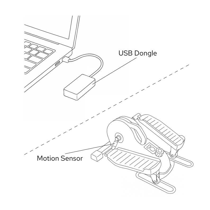 A motion sensor continuously monitors your physical speed and direction, and a USB dongle emulates the corresponding game inputs.
