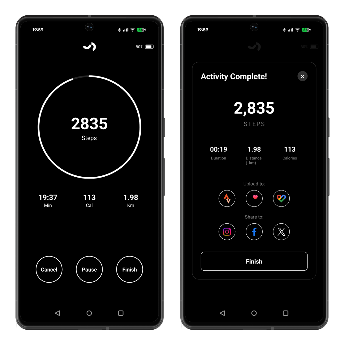 Our free app can track your step count, distance travelled, and calories burned during each workout. Seamless integration with Apple Health, Google Fit, and Strava lets you upload every workout with a single tap.